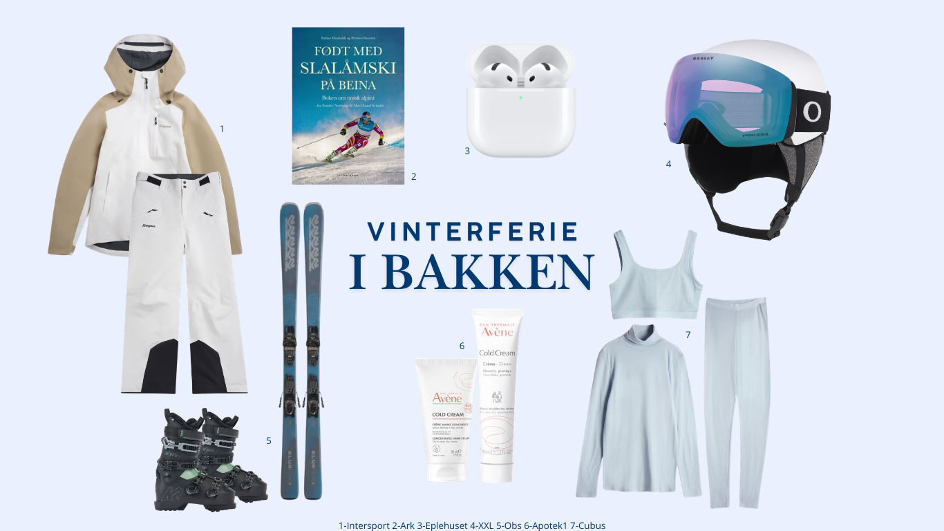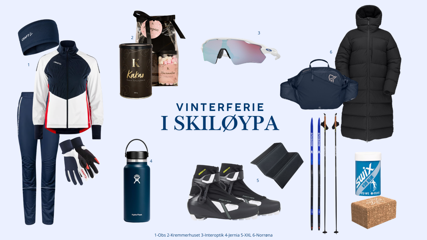 Med gode skiklær fra Obs holder du varmen, mens en varm dunjakke og praktisk rumpetaske fra Norrøna gjør turen ekstra komfortabel. Fyll termoflasken fra Jernia med kakao og marshmallows fra Kremmerhuset, ta på deg raske briller fra Interoptik - og gjør deg klar for en frisk dag ute!